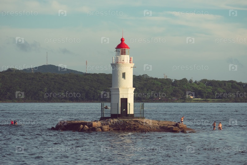Морской пейзаж с видом на белый Токаревский маяк