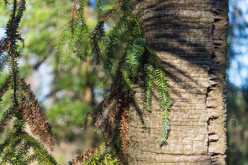 Ветви араукарии на фоне ствола в солнечный день