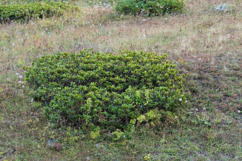 Куст рододендрона на фоне сухой травы и земли на альпийских лугах Красной Поляны в Сочи осенью