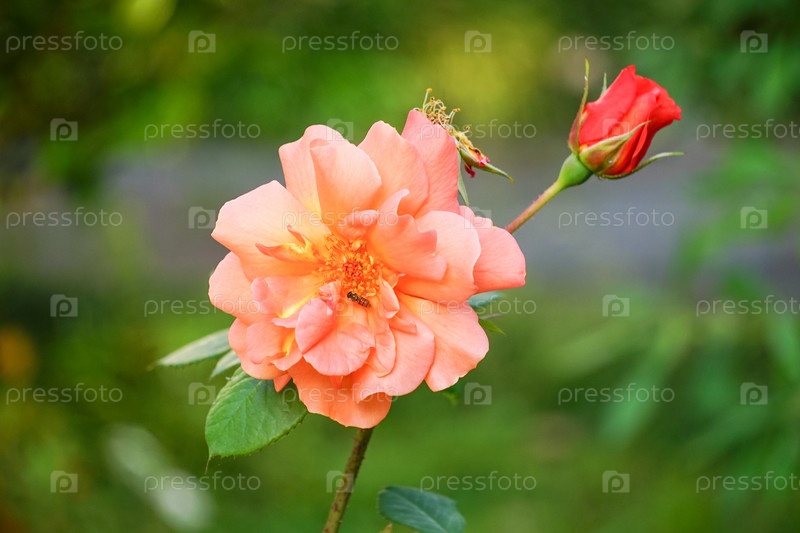Цветочная пышная оранжевая роза на размытом зеленом фоне