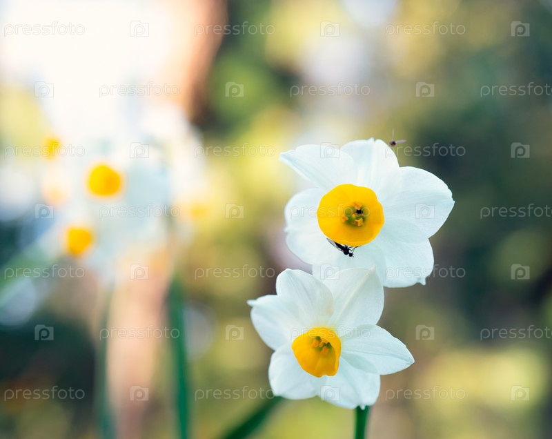 Белые цветы нарцисса на размытом зеленом фоне