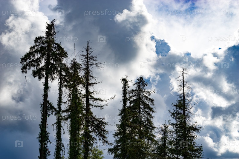 Силуэты высоких старых елей на фоне голубого неба с облаками