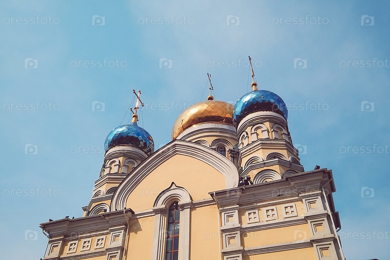 Здание Покровской церкви на фоне голубого неба