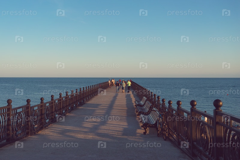 Красивый металлический пирс с черными перилами на фоне моря