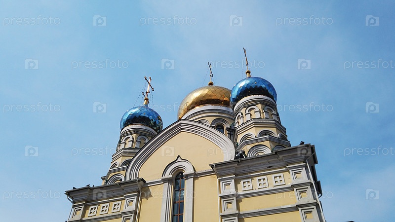 Здание Покровской церкви на фоне голубого неба