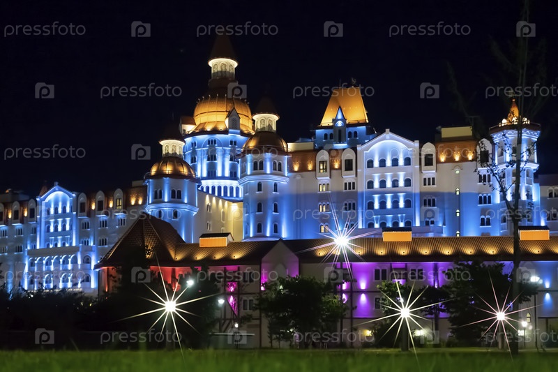 Сочи, Краснодарский край-9 июня 2018 г.: Красивый ночной пейзаж с видом на иллюминацию Сочинского парка