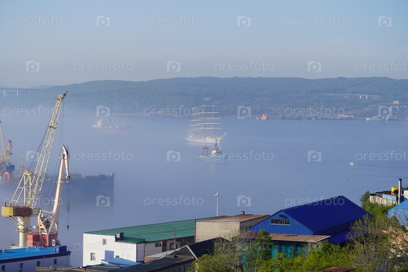 Морской пейзаж с видом на залив и корабли в тумане