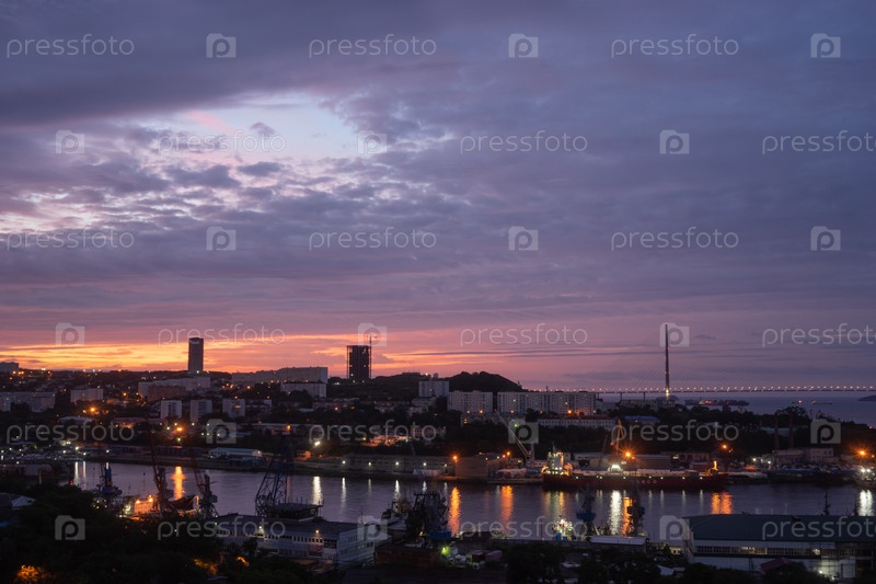 Городской пейзаж с красивым восходом солнца. Владивосток, Россия