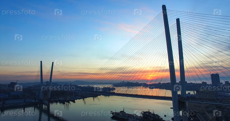 Вид с воздуха на панораму Владивостока с видом на Золотой мост