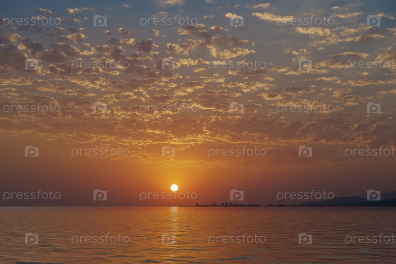 Яркий закат над спокойным морем и красочным небом с облаками на фоне города