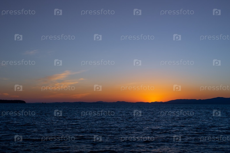Морской пейзаж с закатом на горизонте. Владивосток, Россия