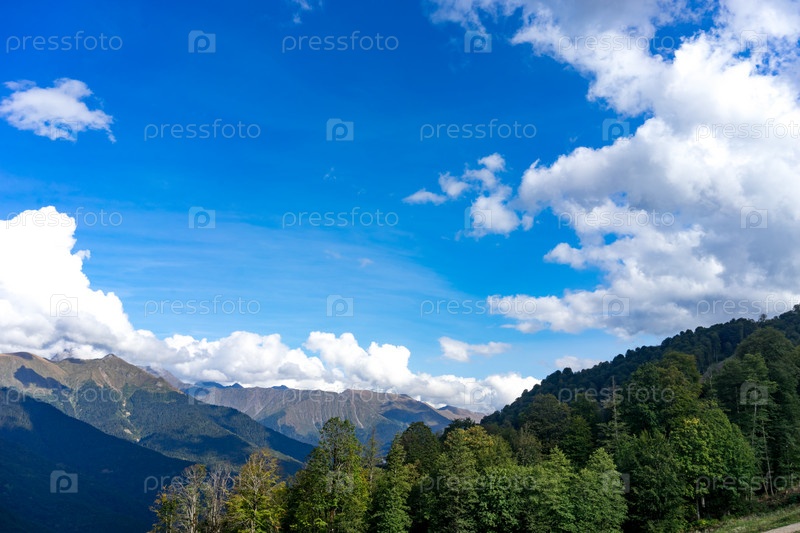 Горный пейзаж против облачного голубого неба
