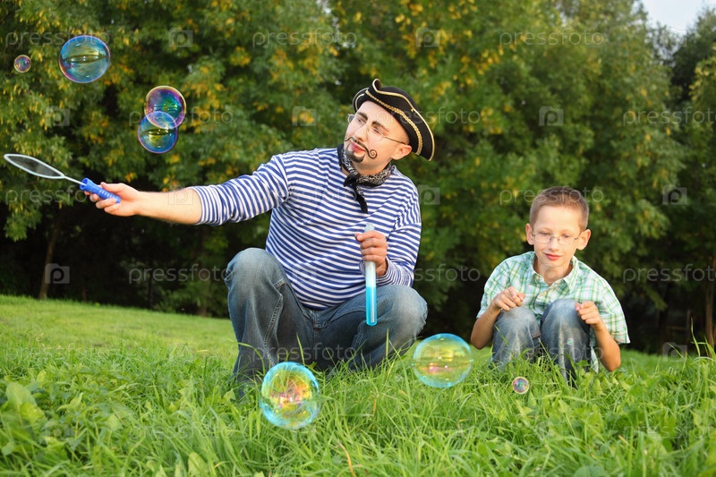 Человек в пиратском костюме развлекает сына мыльными пузырями