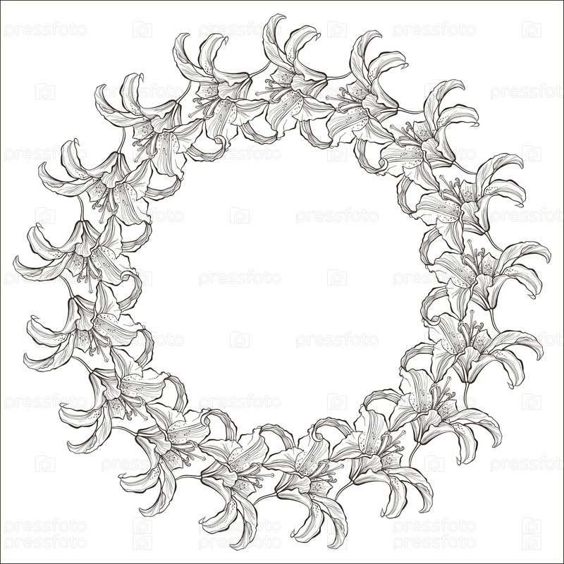 Цветочная монохромная круглая рамка с лилиями. Цветочный фон можно использовать в качестве приглашения или поздравительной открытки. Векторная иллюстрация с пространством для текста