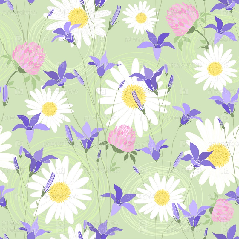 Бесшовный узор с ромашками, клевером и колокольчиками