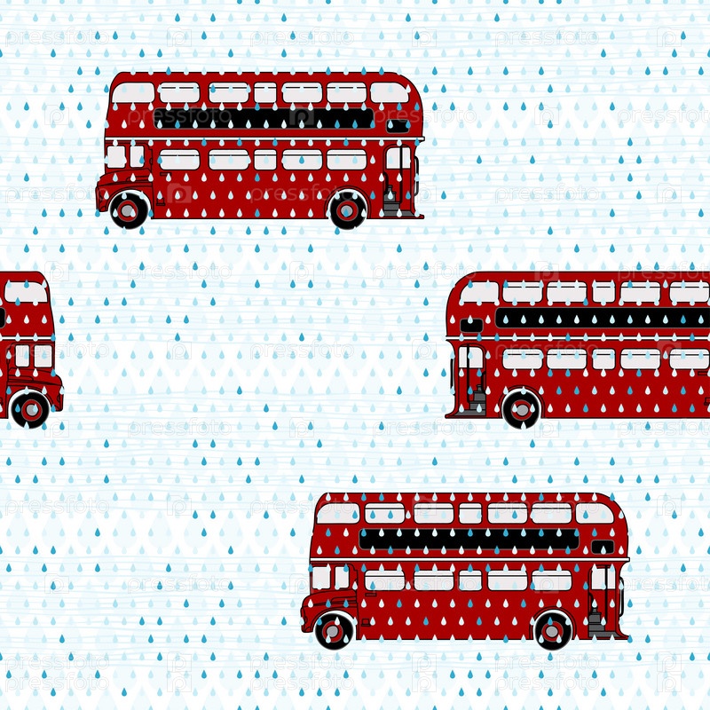 Бесшовный рисунок с двухэтажными автобусами под дождем