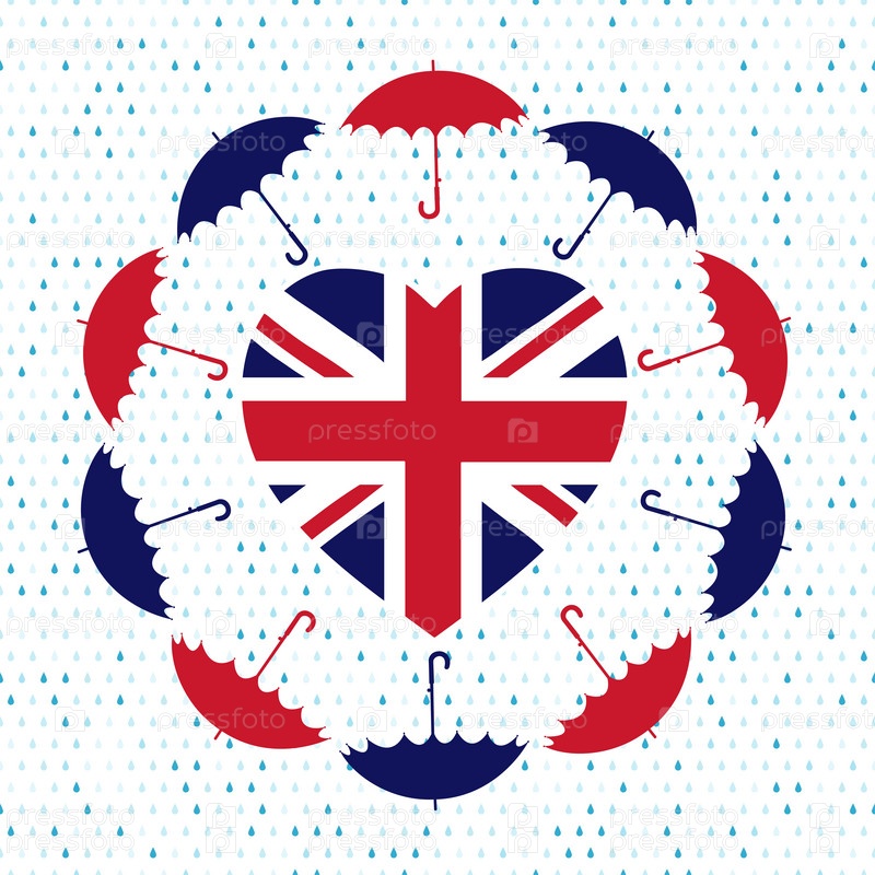 Символ любви Соединенного Королевства. Сердце флаг, зонтики, дождь. Векторная иллюстрация
