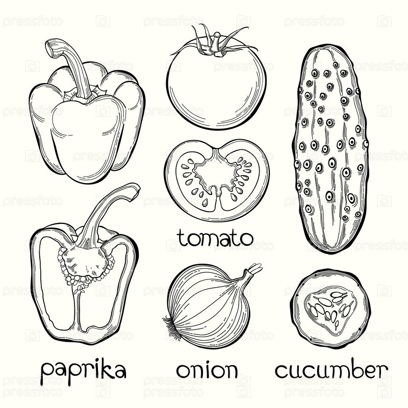 Паприка, помидор, лук, огурец. Векторная иллюстрация на белом фоне. Эскиз
