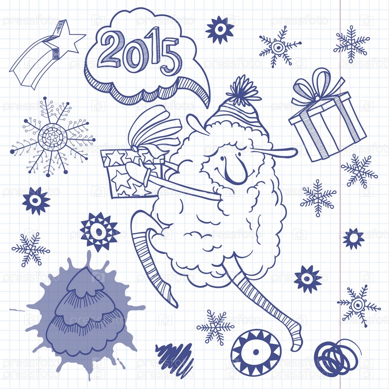 Новогодний набор. Векторная иллюстрация, скеч с ягненком - символ Нового 2015 года