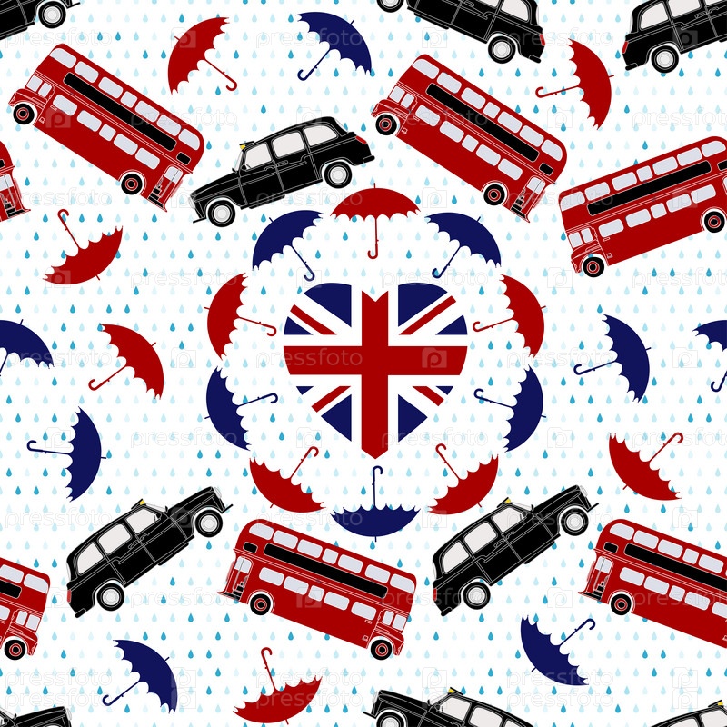 Символ любви Соединенного Королевства. Флаг сердца, двухэтажный автобус, лондонское такси, зонтики, дождь. Векторная иллюстрация