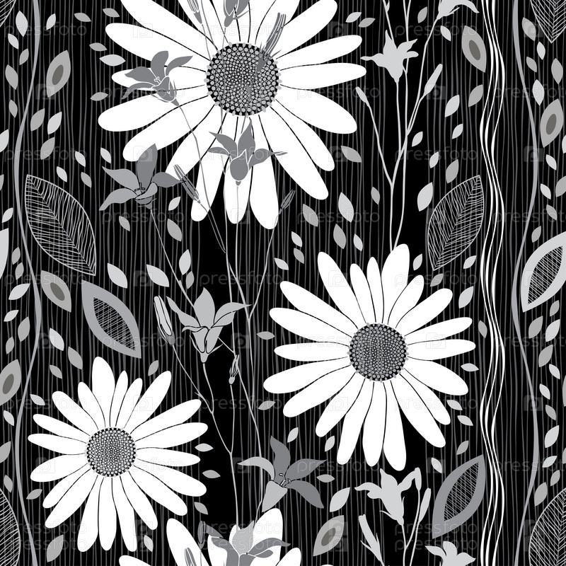Монохромный бесшовный рисунок абстрактных цветов и листьев на черном фоне