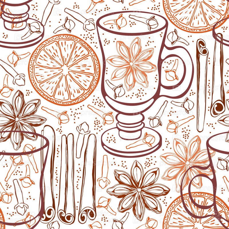 Бесшовный фон с глинтвейном и специями. Ручная векторная иллюстрация
