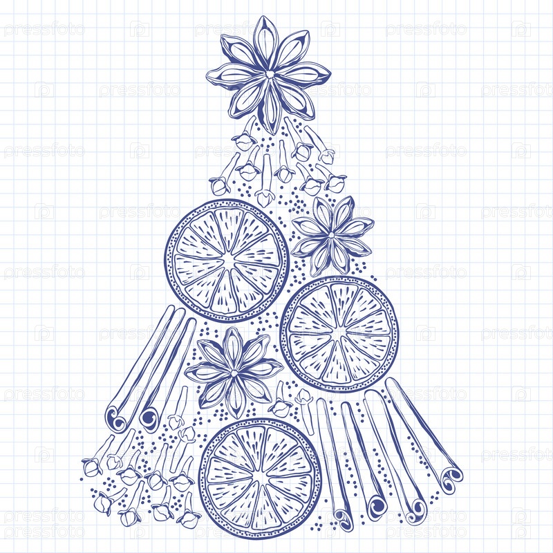 Рождественские украшения. Абстрактная рождественская елка, палочки корицы, анис, апельсин, гвоздика. Эскиз каракулей
