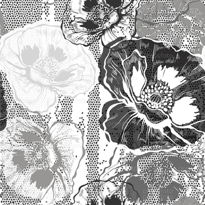 Монохромный бесшовный рисунок с маками. Ручной обращается цветочный фон