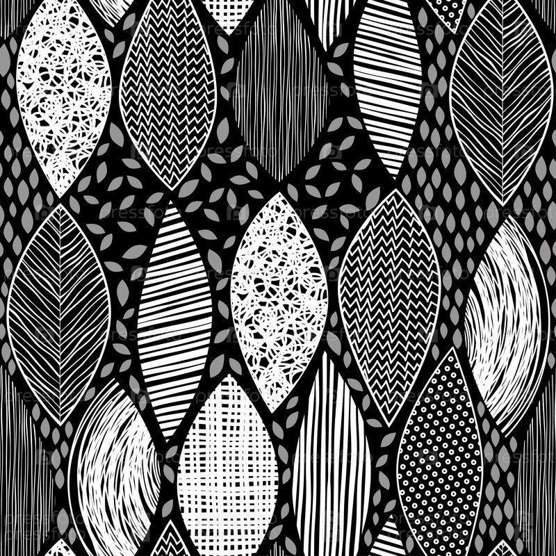 Бесшовный монохромный узор с абстрактными листьями на черном фоне