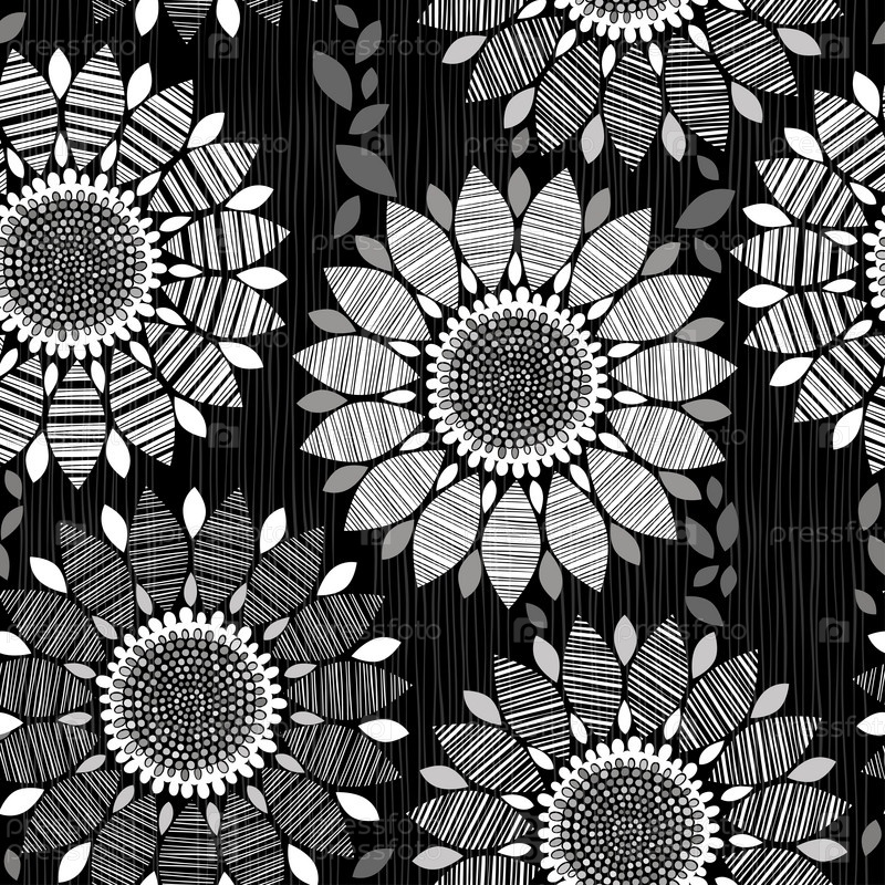 Монохромный бесшовный рисунок абстрактных цветов на черном фоне