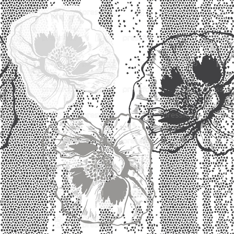Монохромный бесшовный рисунок с маками. Ручной обращается цветочный фон