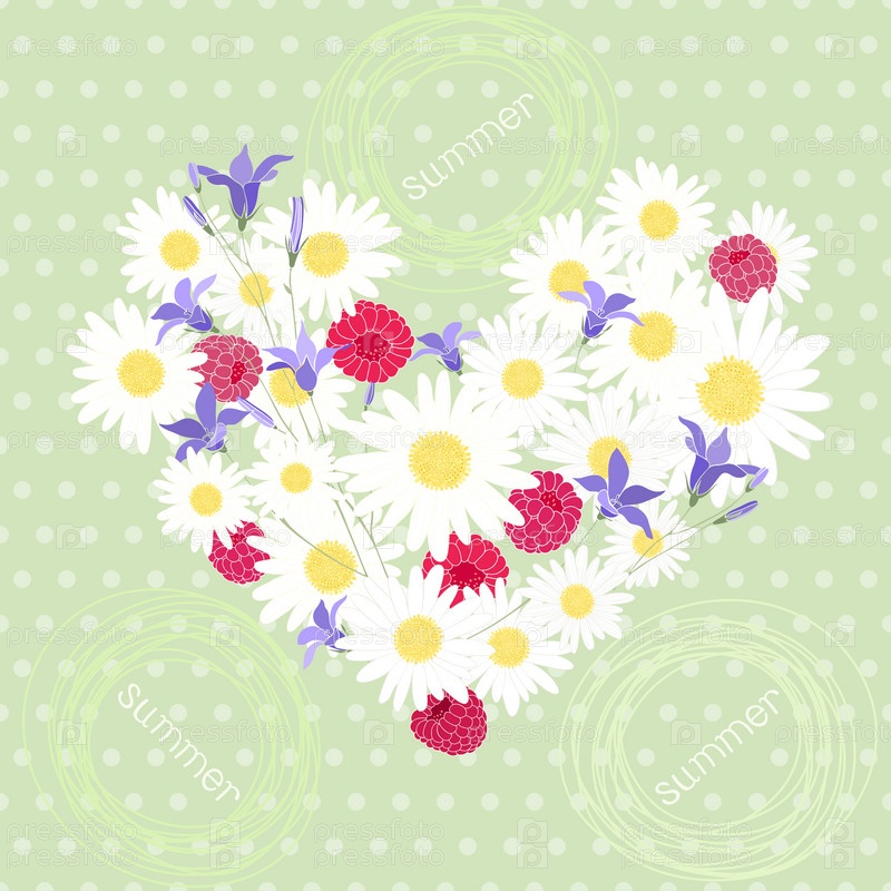 Лето. Фон в горошек с сердечками из ромашек, колокольчиков и малины