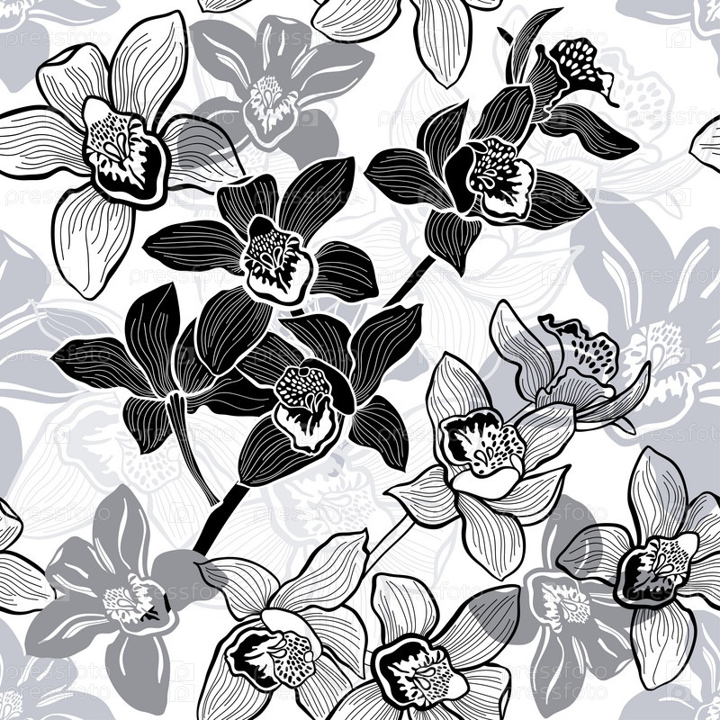 Монохромный бесшовный фон с нарисованными вручную орхидеями