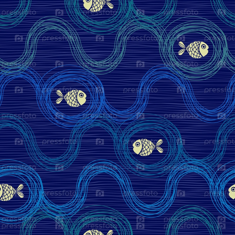 Векторный бесшовный фон из мультяшных забавных рыб и волн