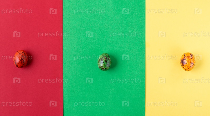 Разноцветные перепелиные яйца на геометрическом фоне. Вид сверху. Креативный пасхальный фон