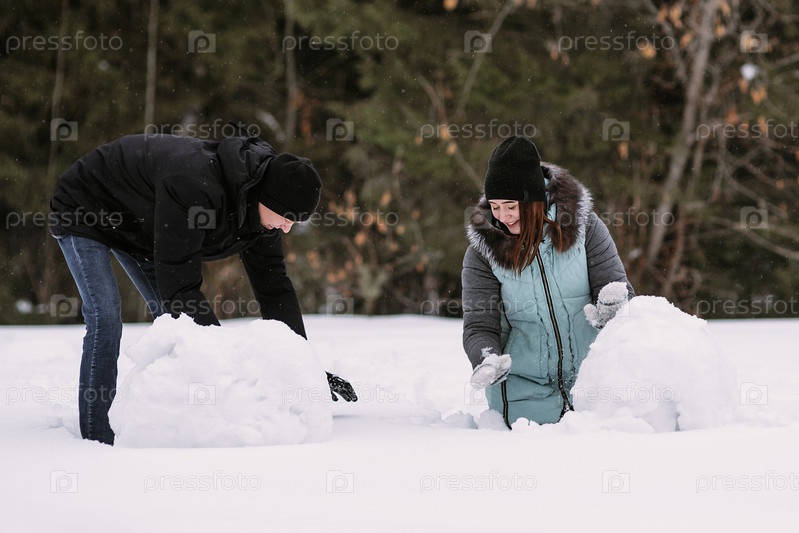 Пара подростков вместе строят снеговика в зимнем лесу