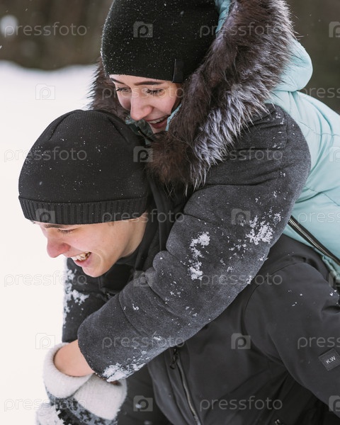 Счастливая пара подростков, весело играющих в снегу в зимнем лесу