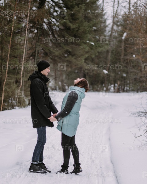 Влюбленная пара подростков, гуляющих зимой