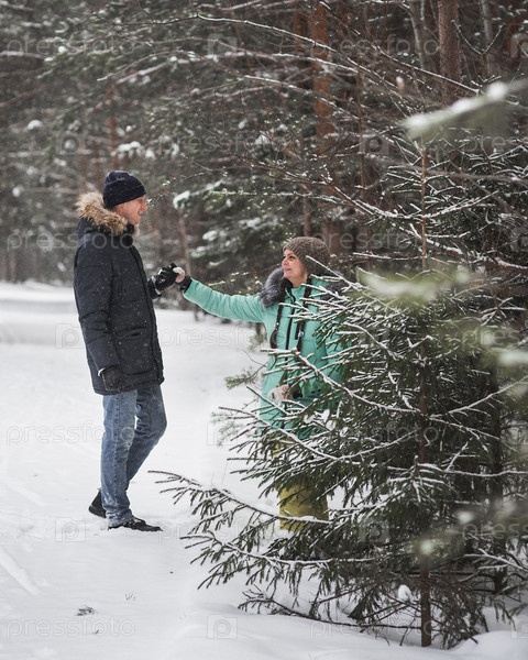 Счастливая молодая пара гуляет в зимнем лесу