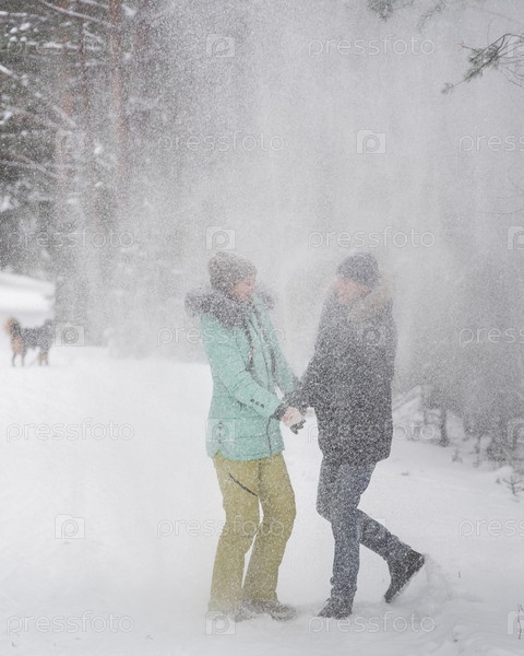 Счастливая молодая пара веселится в снегу и гуляет в зимнем лесу
