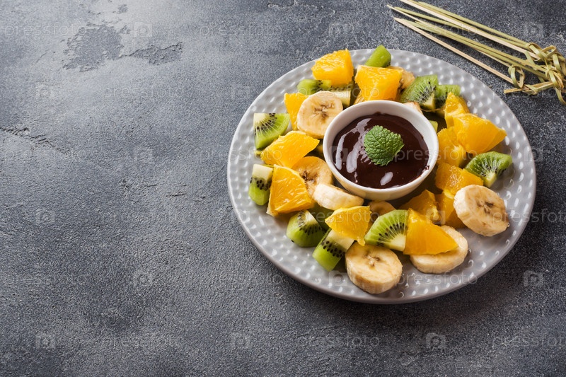 Шоколадное фондю с фруктами на фоне темного бетона. концепция летней вечеринки. Копировать пространство