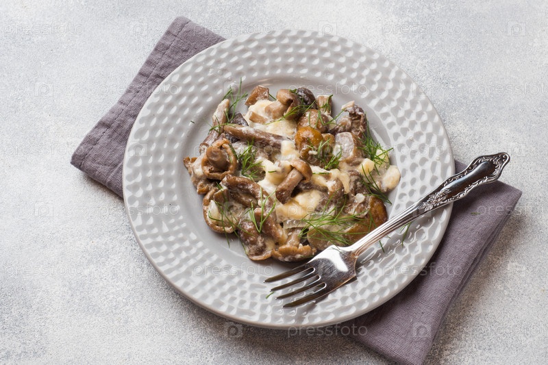 Тушеные грибы в соусе со сметаной и сыром на тарелке