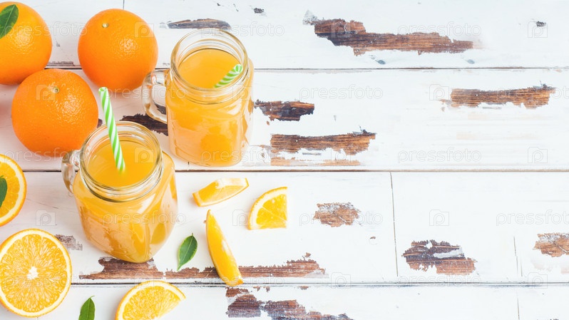 Апельсиновый сок в стеклянных банках и свежие апельсины на белом деревянном деревенском фоне