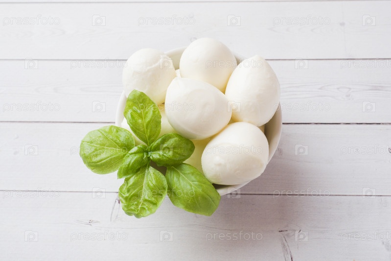 Шарики из моцареллы и базилик в блюде, выборочный фокус