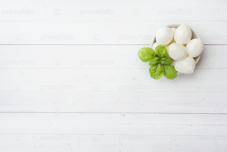 Шарики из моцареллы и базилик в блюде, выборочный фокус