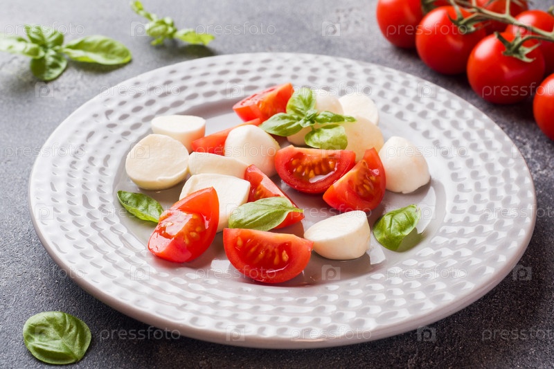 Салат капрезе из помидоров, сыра моцарелла и базилика на темном фоне. Итальянская кухня
