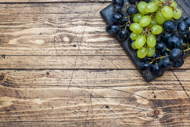 Грозди черного и зеленого винограда Киш Миш на деревянной доске. Скопируйте пространство
