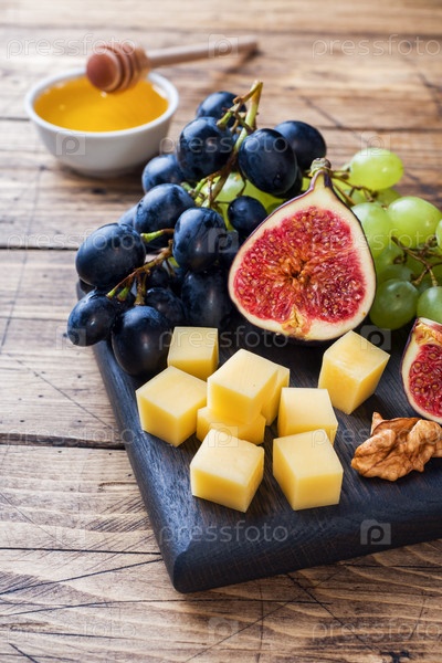 Кубики сыра, свежие фрукты, инжир, виноград, медовый орех на деревянной разделочной доске. Скопируйте пространство