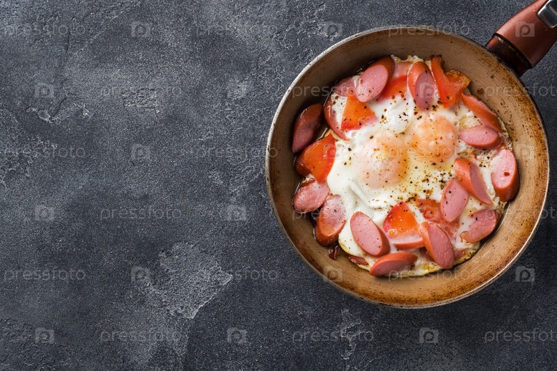 Сковорода с яичницей, сосисками и помидорами на столе. Богатый домашний завтрак