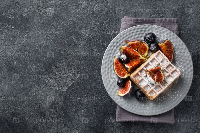 Традиционные бельгийские вафли с сахарной пудрой, виноградом и инжиром. Уютный домашний завтрак. Серый бетонный фон. Скопируйте пространство